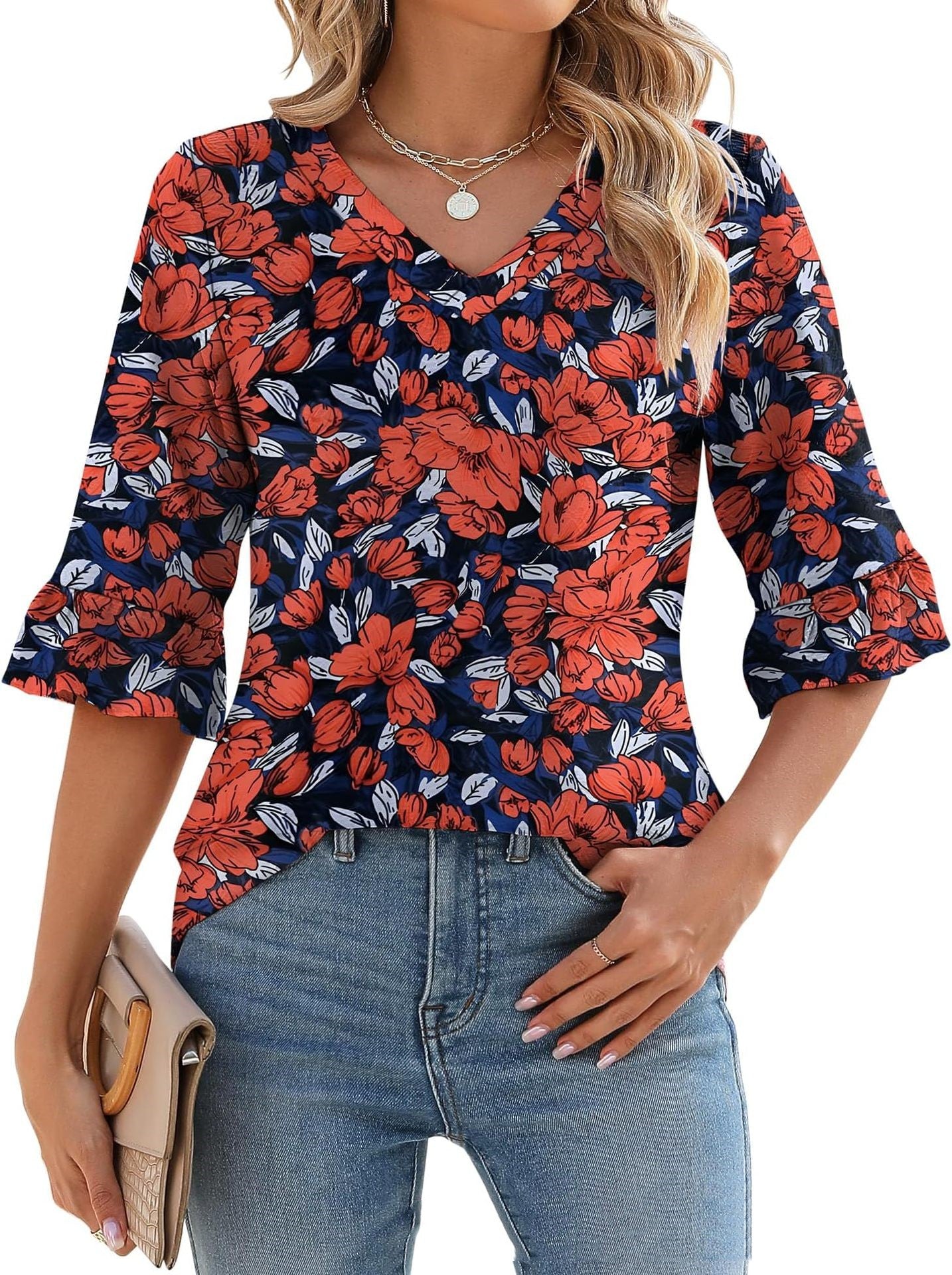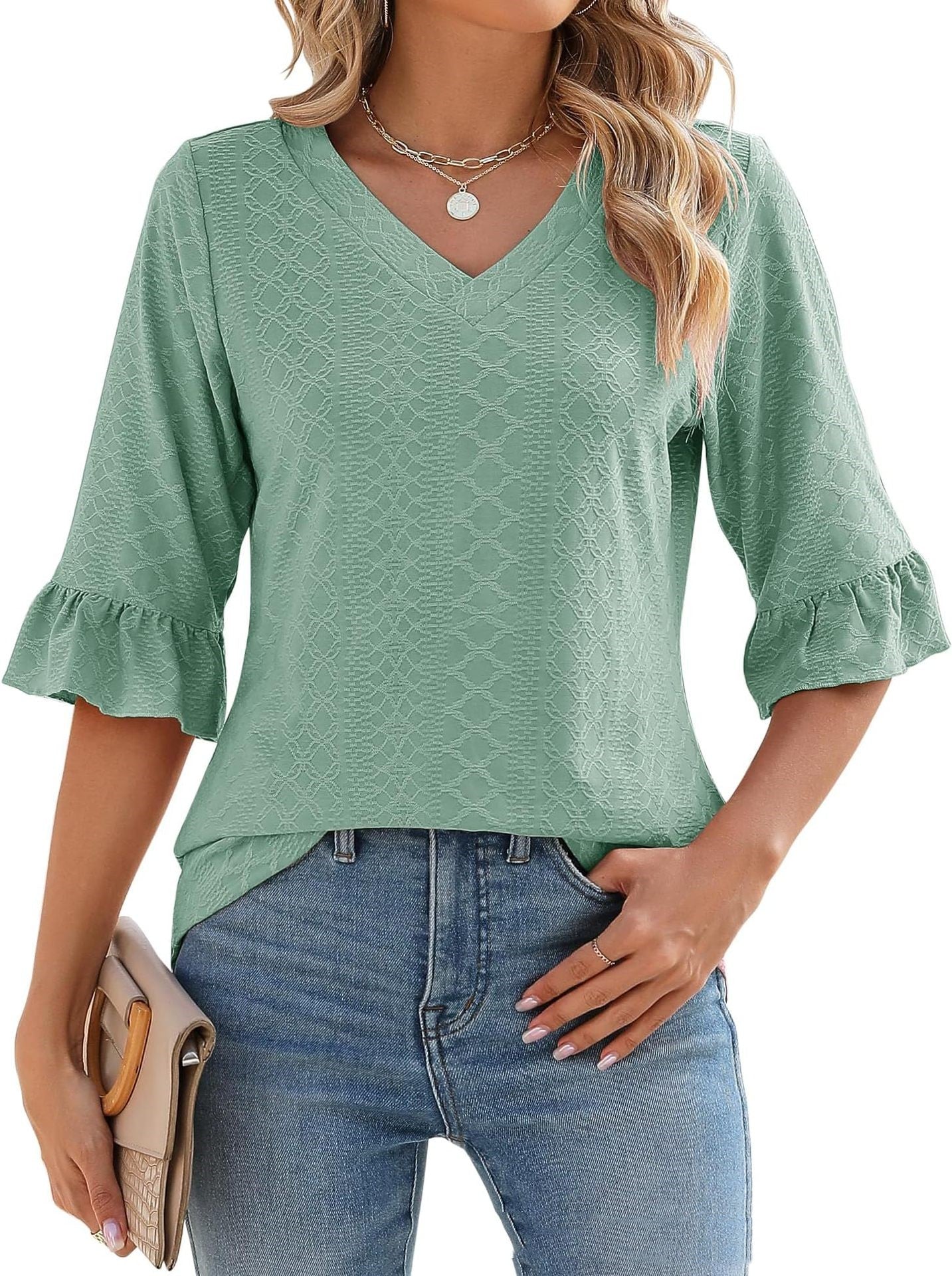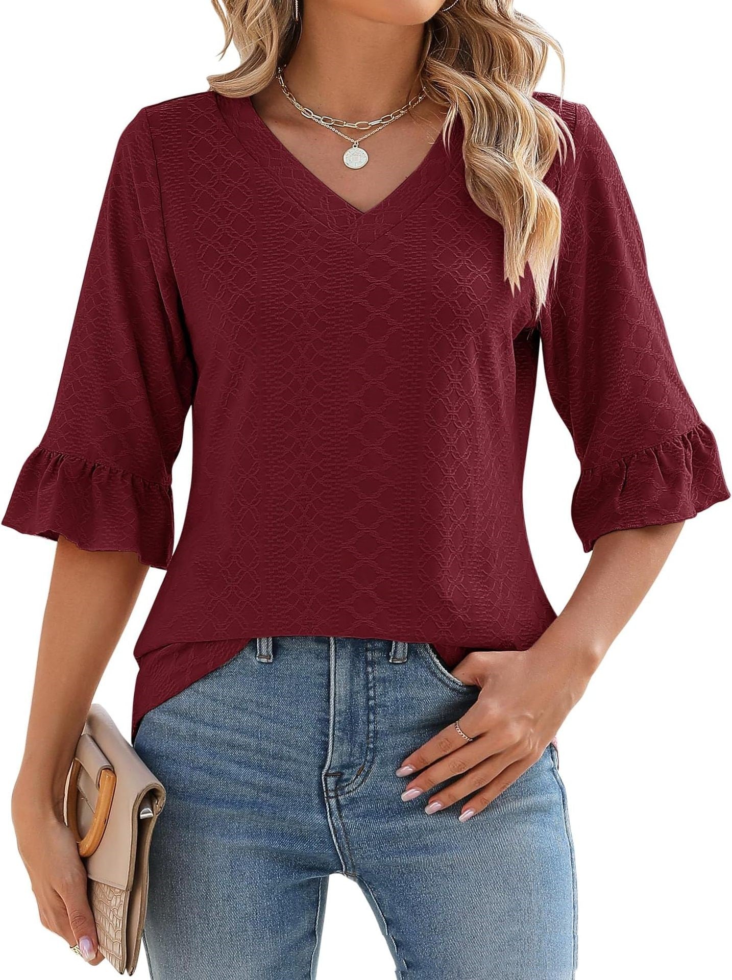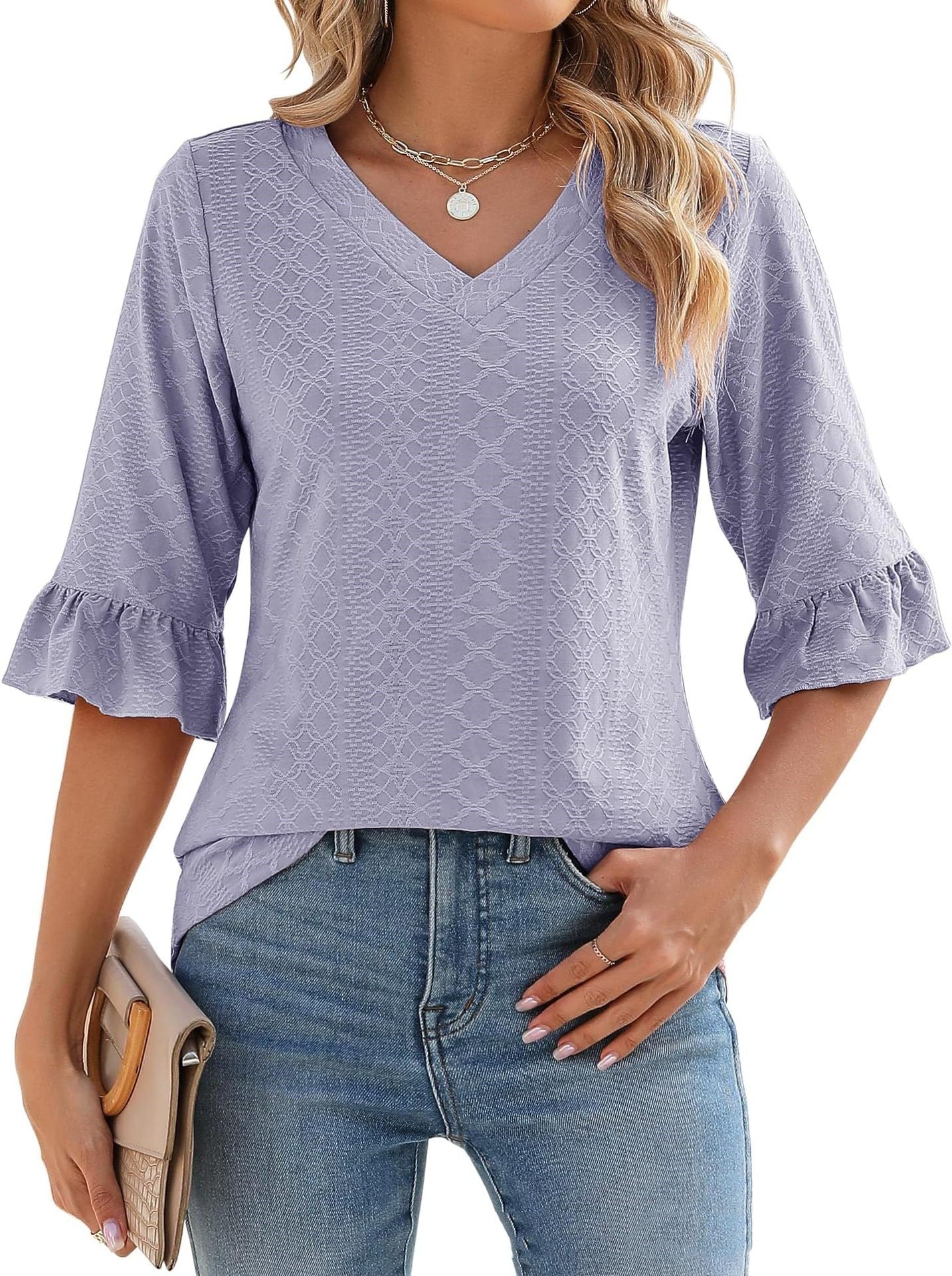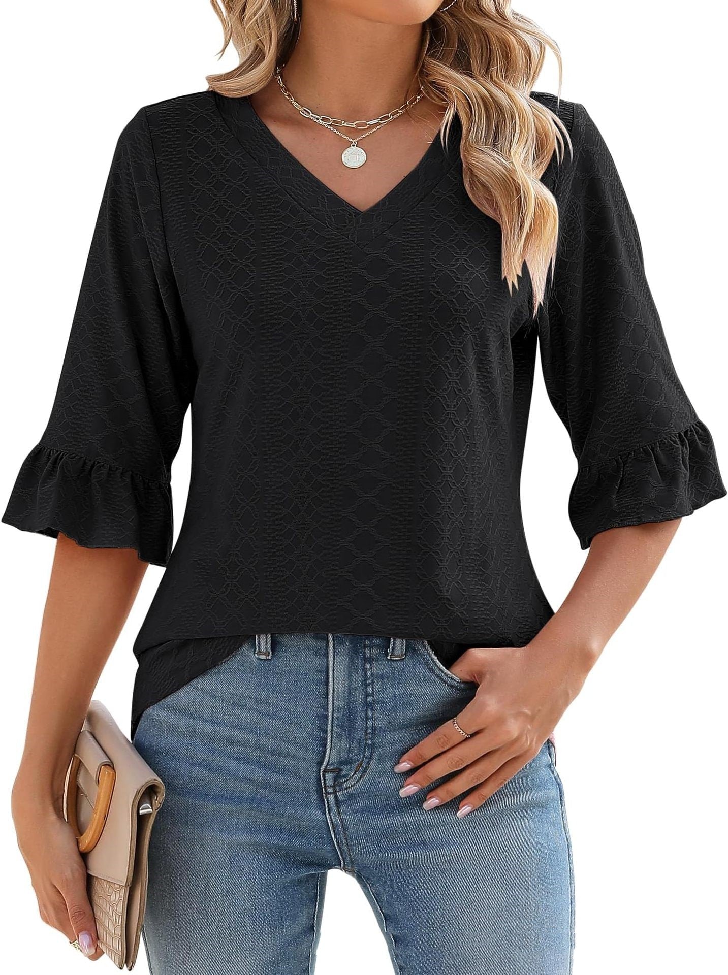 Tissu confortable : Confectionné en rayonne, polyuréthane et polyester, ce haut à col en V offre une sensation de douceur et de confort. Sa texture douce sur la peau flatte votre silhouette, vous permettant de vous sentir à l'aise tout en étant élégante.